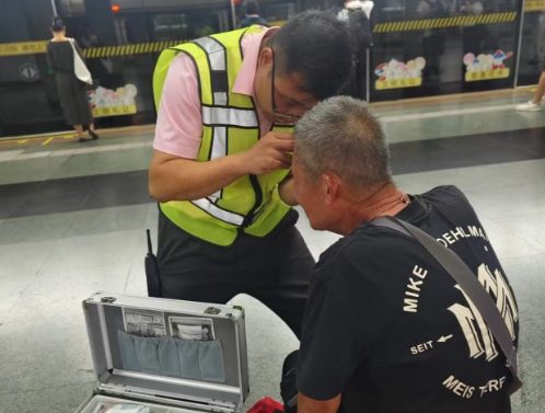 当天下午2时许,邓胤在巡视中发现,一位老年旅客独自靠坐在乘客座椅上,神情异常,且头部侧面隐约可见一处伤痕。他立即快步上前,俯身温和地询问道:“老师傅,您哪里不舒服?需要帮助吗?”经耐心沟通得知,老人是从外地来上海游玩,方才在南京路步行街不慎摔倒。起初老人觉得问题不大,但行至地铁站后突然感到头晕,便坐下休息,其家人正在不远处的自动贩卖机为其买水。