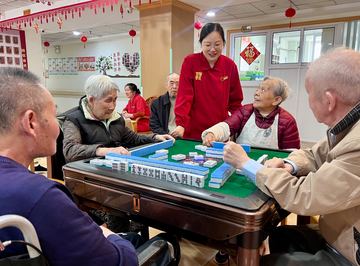 10月23日上午10点半,长宁区金福第三养老院,90后护理主管谭青林正在3楼看望凑在一起打麻将休闲的爷爷奶奶们,询问他们的身体状况,陪他们“嘎讪胡”。