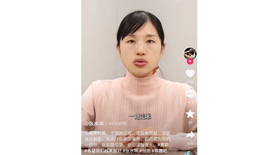2026年初,张水华正式递交辞职信,这似乎都在大家的意料之中。她的职业转折并非偶然,似乎是爱好与工作长期冲突后的必然结果。