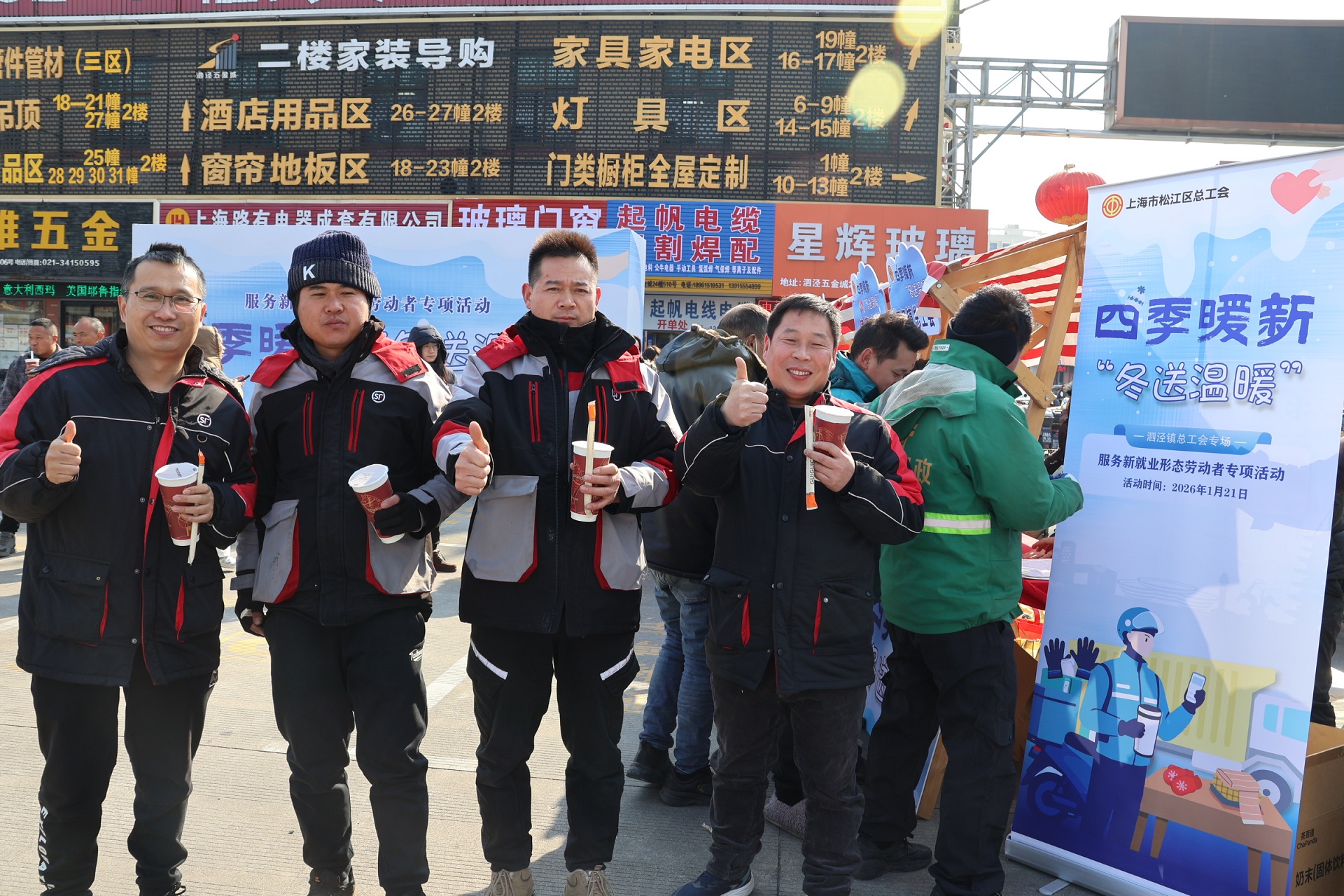 大家收到松江区总工会和泗泾镇总工会送的暖心热饮。