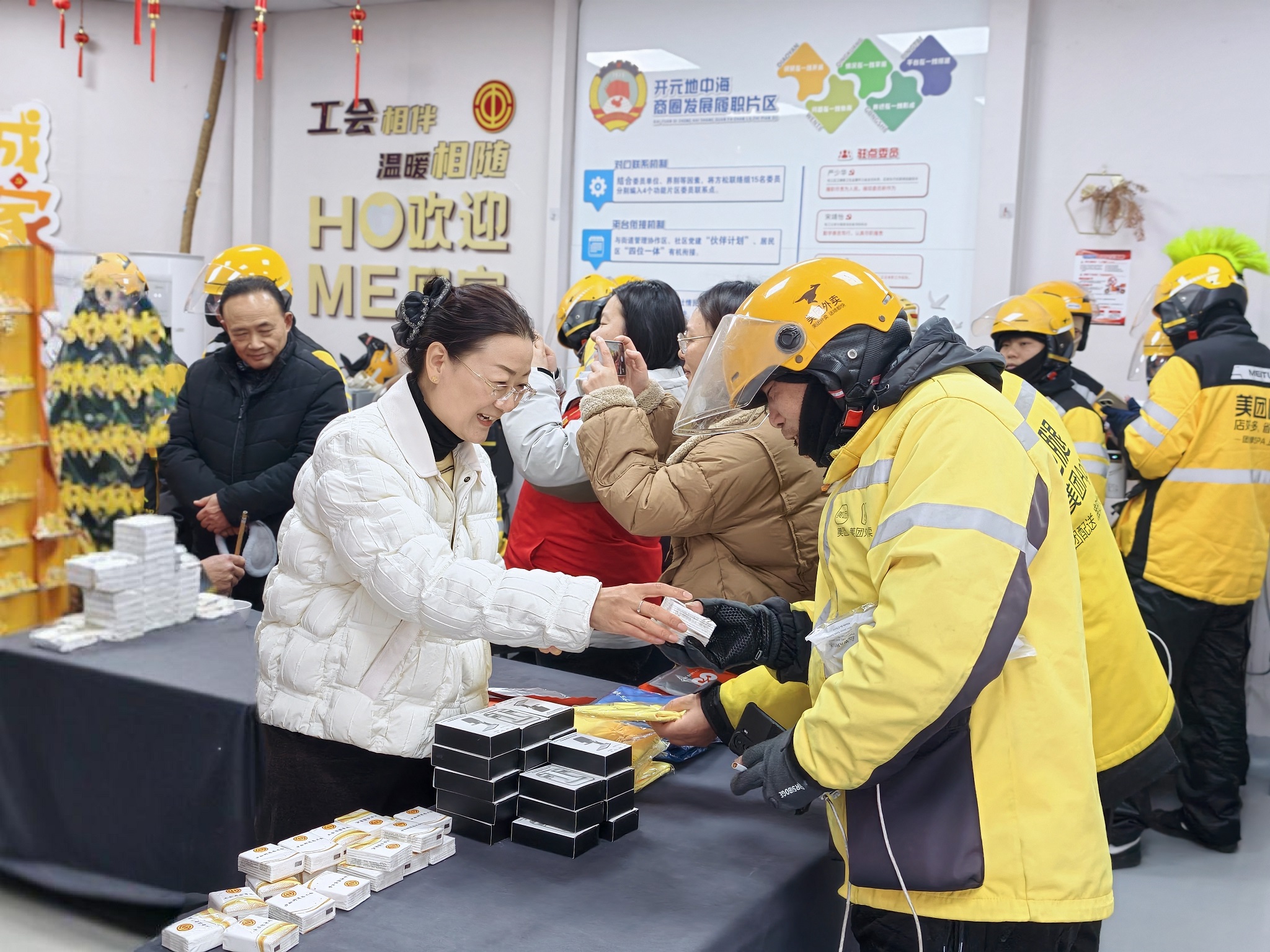 本次“冬送温暖”活动在全区全面铺开,在同一时间,岳阳街道乐颂坊商圈同样准备充分,防风手套、暖体泡脚包等物资,让新就业劳动者抵御严寒,同时,扫码入会、电瓶车检修等“一站式”便捷服务同步开展,全方位满足劳动者的多元需求。其他工会驿站也同步开展特色活动,泖港蓝色港湾工会驿站推出温暖三件套、新春柿柿如意手工制作等活动;方松街道开元爱心接力站为小哥们准备了围巾、保暖耳罩和香气四溢的奶茶;小昆山总工会为大家熬了热腾腾的腊八粥。现场多位刚送完订单前来歇脚的户外职工表示,在寒冷天气里收到工会实用又细致的关怀,感到非常惊喜和感动,“这些东西特别实在,喝了热饮全身都暖呼呼的,还能顺便检查下车子电瓶,工会想得太周到了!”据统计,本次“冬送温暖”活动累计服务千余名户外职工和新就业形态劳动者。