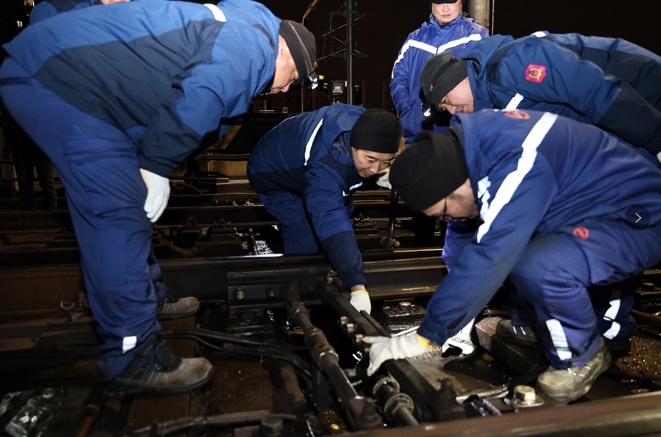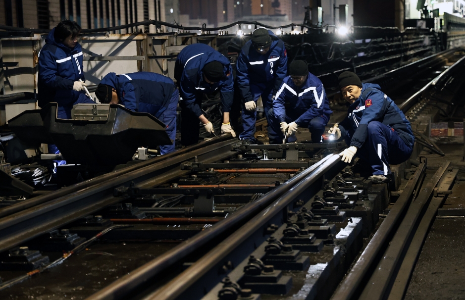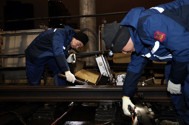 “进入三九严寒,低温会对道岔转折设备造成机械部件卡阻、杆件变形等问题。如果碰到雨雪天气,道岔尖轨与基本轨之间以及杆件连接处容易结冰冻粘,阻碍道岔转换,影响列车变道。”瑟瑟寒风中,杨帅搓着手向记者介绍道,他们今天要对线路上的2副道岔转辙设备进行维护,擦除内部水汽,并对道岔动作处进行加油,防止低温结冰。“这几天是寒潮天,以往按图定发车时刻出场的巡道车,会提前半小时出发。因此,我们今天晚上的作业时间只有3个半小时,时间很是紧张。”
