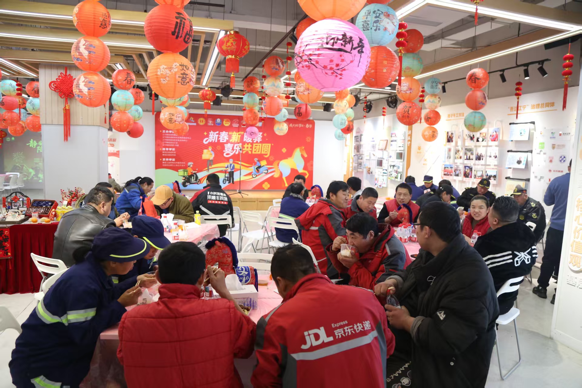 农历新年将至,年味渐浓。2月4日中午,江宁路街道党群服务中心内欢声笑语、暖意氤氲,“新春‘新’暖驿 喜乐共团圆——2026年江宁路街道党群服务中心@你过大年”新春主题活动在此温情启幕。百余名外卖骑手、快递小哥等新就业形态劳动者代表欢聚一堂,共赴团圆家宴、体验传统年俗、观赏文艺展演、领取暖心礼包,在奔波忙碌的间隙,卸下疲惫,感受浓浓的节庆氛围与“家”的温情守护。