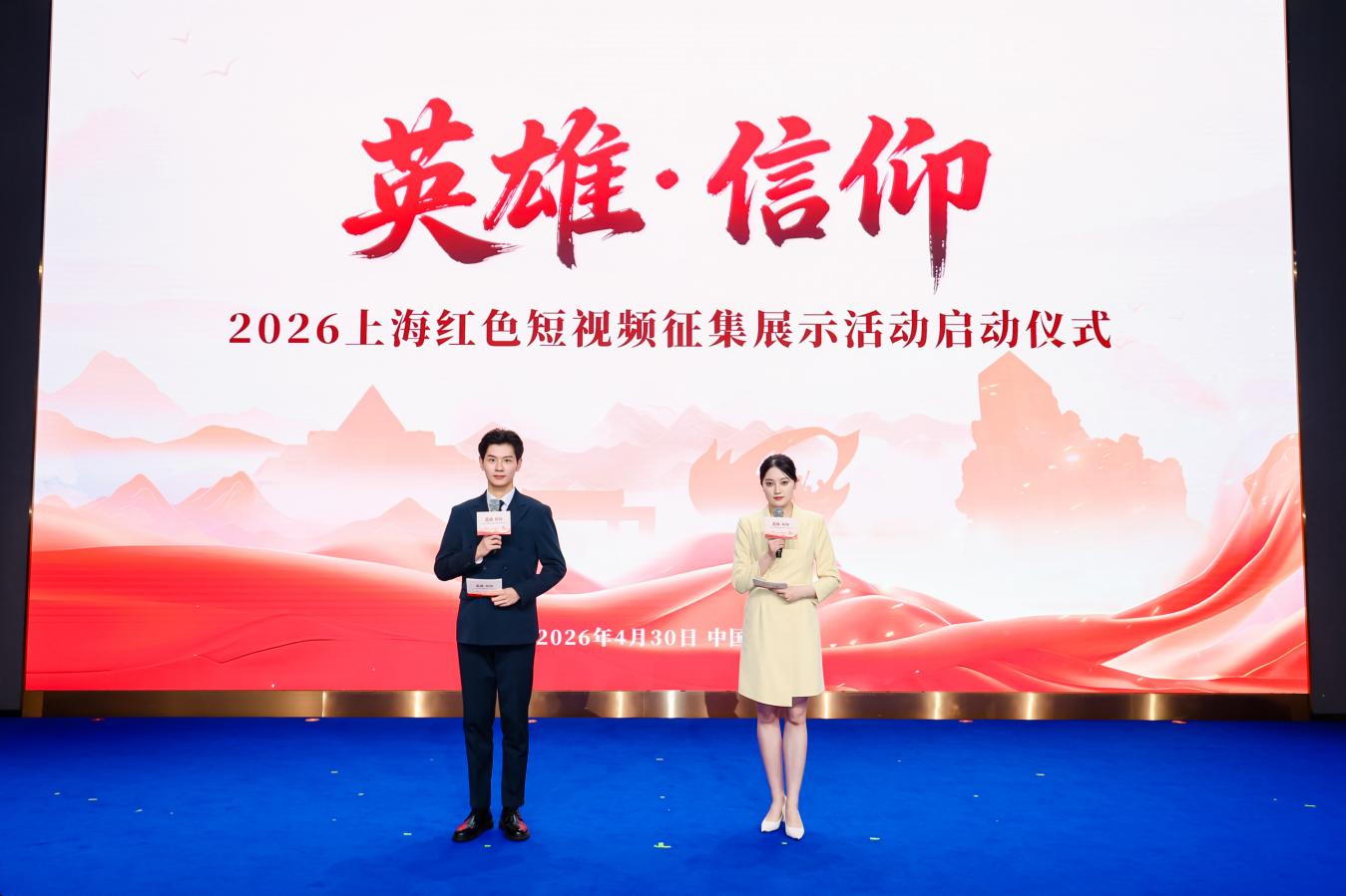 4月30日,2026年“英雄・信仰”红色短视频征集展示活动启动仪式在上海国际传媒港金盒子一号厅举行。上海市退役军人事务局局长余成斌、中央广播电视总台上海总站站长陈永庆、中央广播电视总台军事节目中心副主任侯东合、同济大学党委副书记曹静、上海市委党史研究室副主任王旭杰、烈士家属代表俞秀松继子俞敏共同上台,正式启动本次征集展示活动。